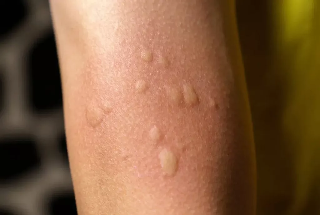 - ظاهر شدن کهیر (Urticaria): پاپولها یا پلاکهای برجسته، صورتی یا قرمز، معمولاً با هاله قرمز اطراف.