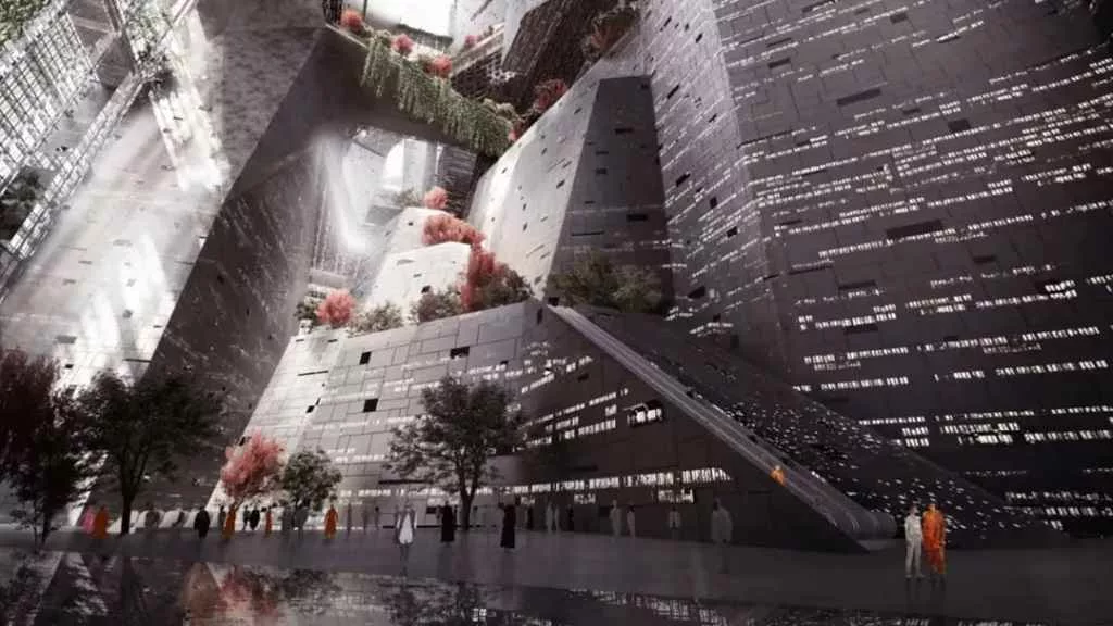 یکی از بخشهای کلیدی پروژه، «هیدن مارینا» بود؛ ناحیهای بندری در میانهی صحرا که کشتیهای غولپیکر کروز میتوانستند در آن پهلو بگیرند. بر بالای آن، قرار بود یک ساختمان ۳۰ طبقهی معلق مانند چلچراغ از قوس بندر آویزان شود. اما طراحان هشدار دادند که پویایی ساختاری چنین سازهای ممکن است به فاجعه منجر شود.