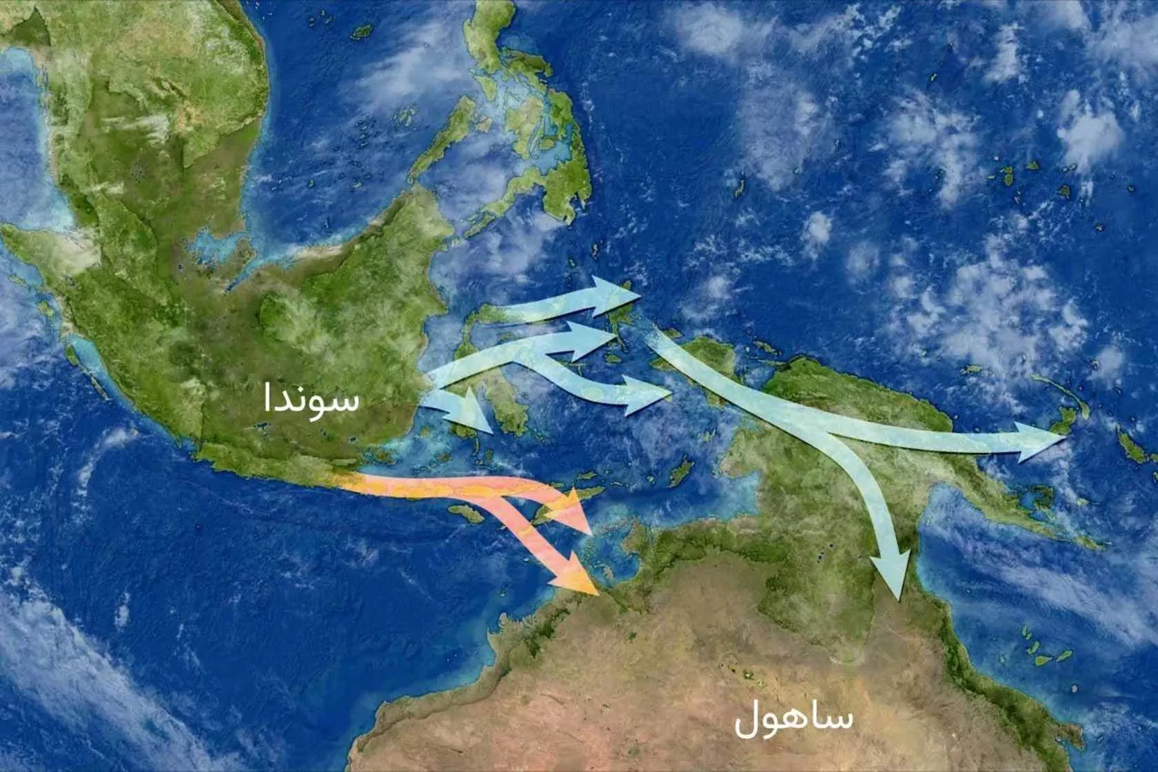 - عبور از سوندالند: مهاجران از طریق سوماترا، جاوه و بورنئو که به خشکی اصلی متصل بودند، به سمت جنوب شرقی حرکت میکردند.