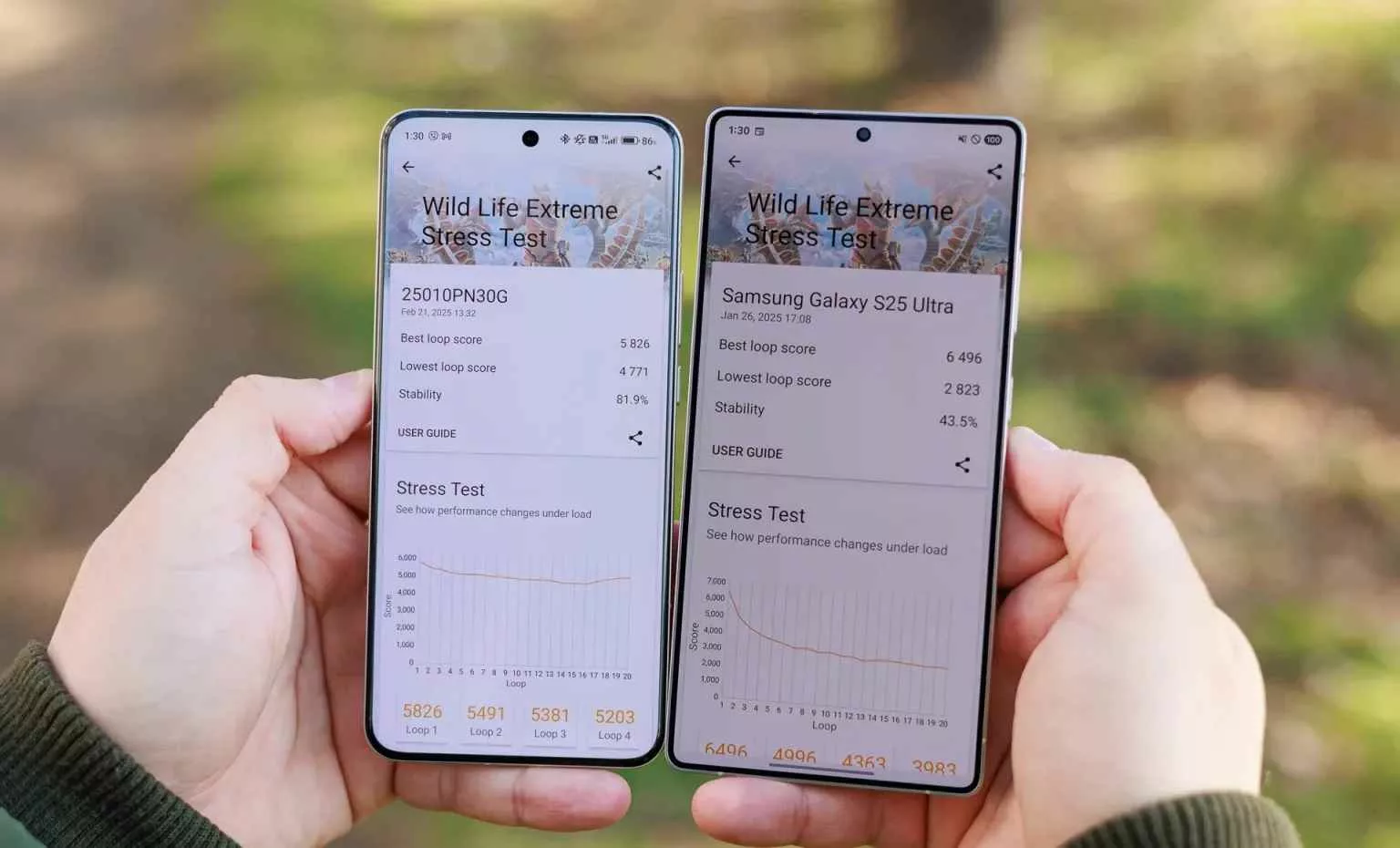 در تست ۳۰ دقیقه گیمینگ، شیائومی افت عملکرد ۸٪ داشت، ولی سامسونگ ۱۲٪ افت را تجربه کرد.