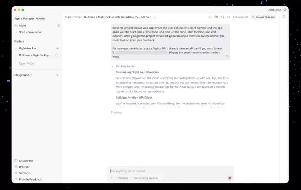 در این بخش، محیطی شبیه به «اتاق فرمان» در اختیار کاربر قرار میگیرد. توسعهدهنده میتواند همزمان چند پروژه، چند ایجنت و چند تسک را در فضاهای کاری مختلف دنبال کند. هر ایجنت بهصورت بلادرنگ وضعیت کاری خود را گزارش میدهد، درست مانند تیمی از توسعهدهندگان انسانی که زیر نظر یک مدیر پروژه فعالیت میکنند.