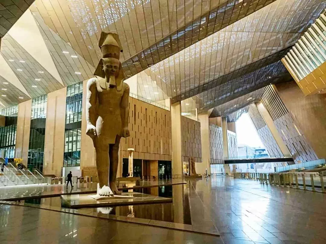 در ورودی، آتریومی عظیم با سقفهای شفاف شیشهای، بازدیدکنندگان را به تماشای مجسمه غولپیکر رامسس دوم با ارتفاع ۱۱ متر و وزن بیش از ۸۰ تُن دعوت میکند — اثری که با دقت از شهر ممفیس به موزه منتقل شد. انتقال این مجسمه خود پروژهای مهندسی پیچیده بود که از طریق سیستمهای پیشرفته هیدرولیکی و جرثقیلهای عظیم انجام پذیرفت.