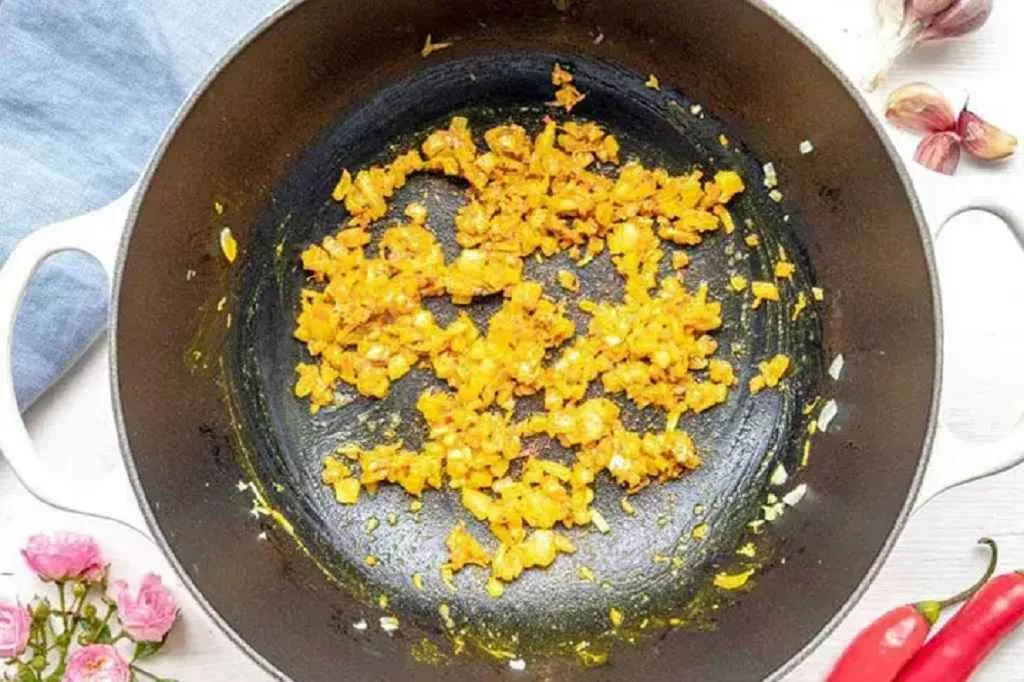 سپس سیر رندهشده را اضافه کنید و همراه با زردچوبه، چند ثانیه تفت دهید تا عطر سیر و ادویهها آزاد شود.