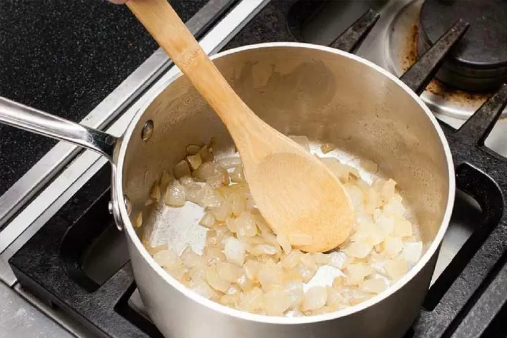 در این مرحله، آرد سفید را به مخلوط پیاز و سبزیجات اضافه کنید و ۱ تا ۲ دقیقه روی حرارت ملایم تفت دهید.