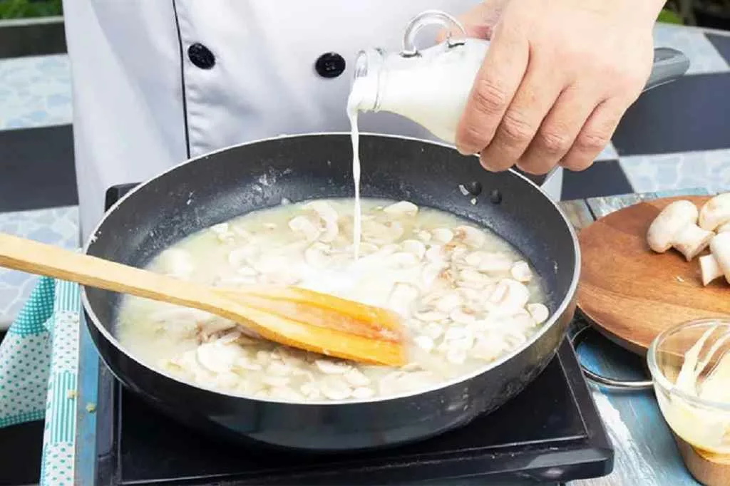 حدود چند دقیقه پایانی پخت، اگر قصد تهیه سوپ قارچ خامهای دارید، خامه صبحانه را اضافه کرده و بهآرامی هم بزنید تا سوپ کاملاً یکدست و لطیف شود. پس از افزودن خامه، سوپ نباید زیاد بجوشد.