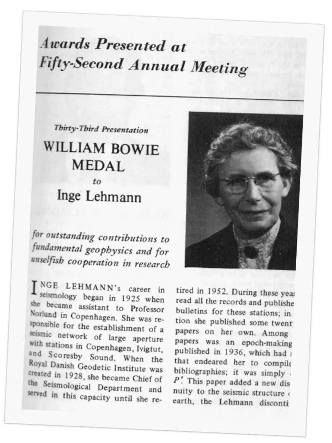در سال 1936، اینگه لیمان مقالهای کوتاه و در عین حال انقلابی با عنوان “زمینلرزهشناسی: امواج P در هسته زمین” (P’ – Preliminary Note on the Identity of the P’ Wave in Seismic Records) منتشر کرد. این مقاله، که در ژورنال دانمارکی “انالهای ژئوفیزیک” به چاپ رسید، صرفاً بر اساس چند صفحه محاسبات دستی و نمودارها استوار بود.