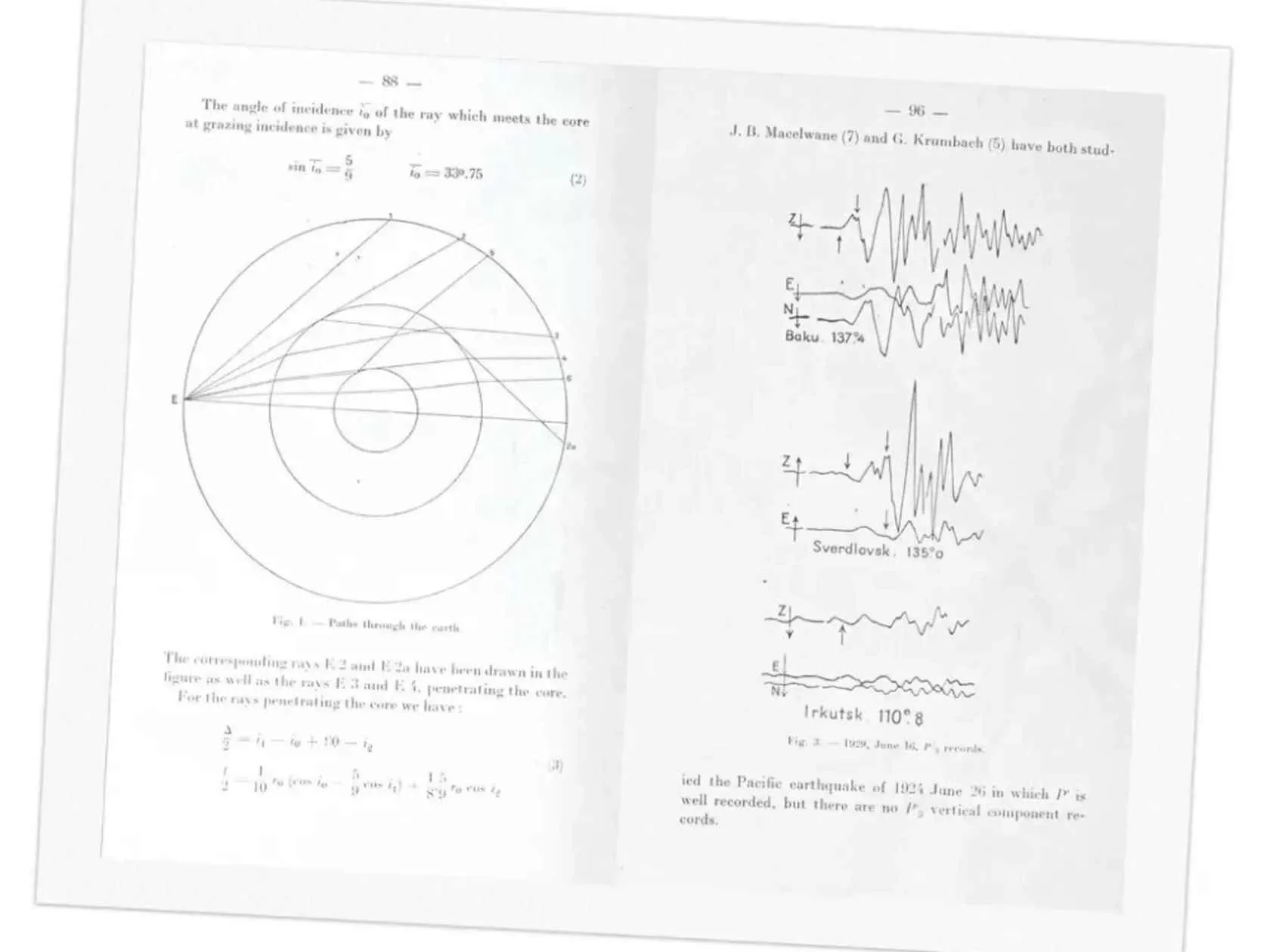 او نوشت: “تحلیل دقیقتر منحنیهای زمانرسیدن امواج P نشان میدهد که اثرات شکست ناشی از هسته زمین، تنها با فرض وجود یک هسته داخلی جامد قابل توجیه است.”