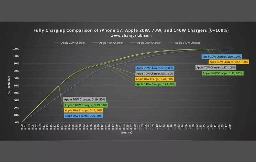 تمام تستها نشان دادند که آیفون ۱۷ هیچگاه بیش از ۳۶ وات توان نمیپذیرد و عملکرد شارژرهای قدرتمند، به دلیل مدارها و نرمافزار محدودکنندهی خود گوشی، فراتر نمیرود.