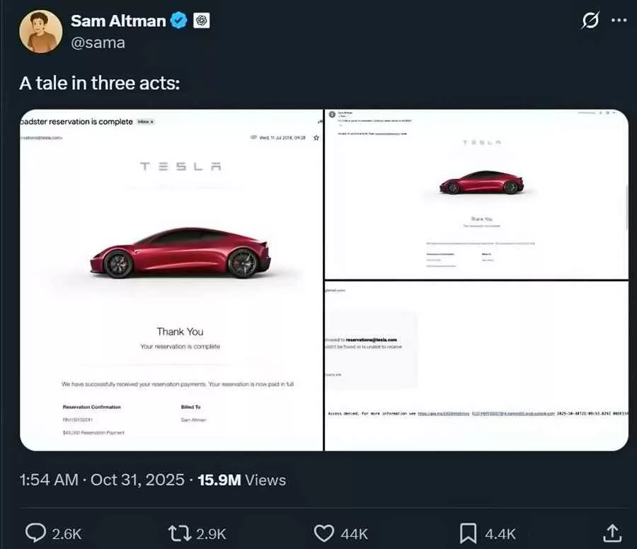 در ۳۱ اکتبر ۲۰۲۵، سم آلتمن با انتشار جمله کوتاه «یک داستان در سه پرده» و سه اسکرینشات از پرداخت رزرو تسلا رودستر، آغازگر داستانی شد که هنوز داغ است. تصاویر نشان میدادند او در ۲۰۱۸، مبلغ ۴۵ هزار دلار برای سفارش رودستر نسل جدید پرداخت کرده و پس از ۷ سال انتظار، هنوز خودرو را دریافت نکرده است.