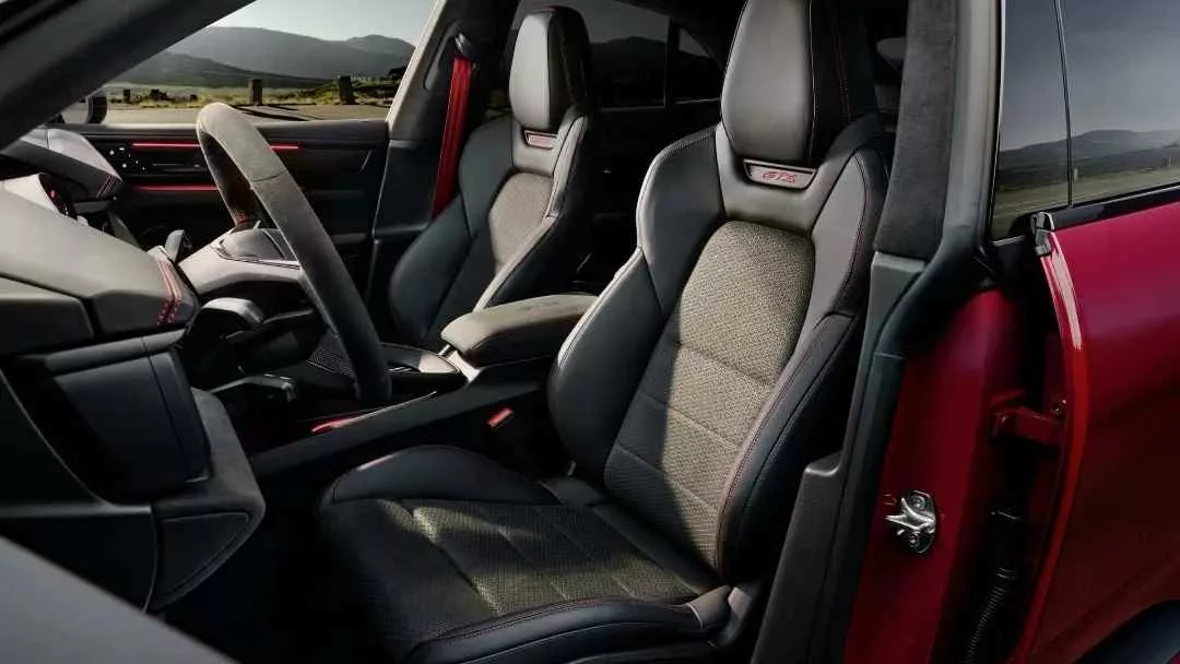 تریم فیبرکربن داخلی، دوخت رنگی هماهنگ با بدنه و فرمان اختصاصی با لوگوی GTS بر روی فرمان و داشبورد.