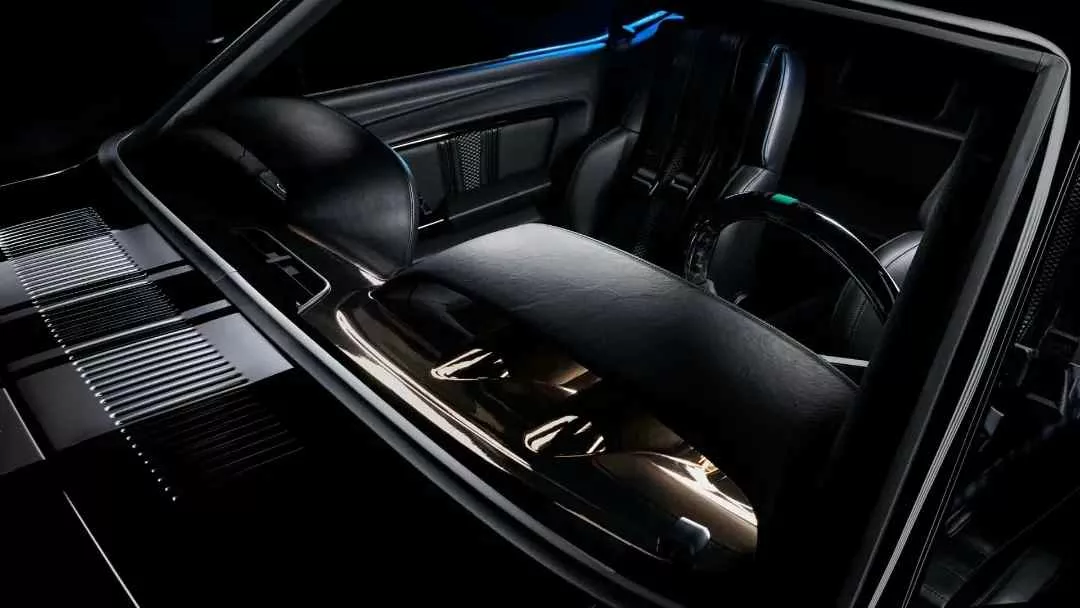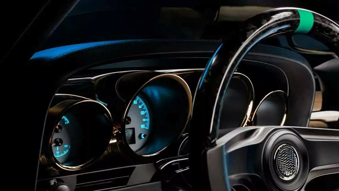 داشبورد سهبعدی، نمایشگرهای Dakota Digital، سیستم تهویهی Vintage Air، و صندلیهای چرم Nappa با رولکیج پنهان.