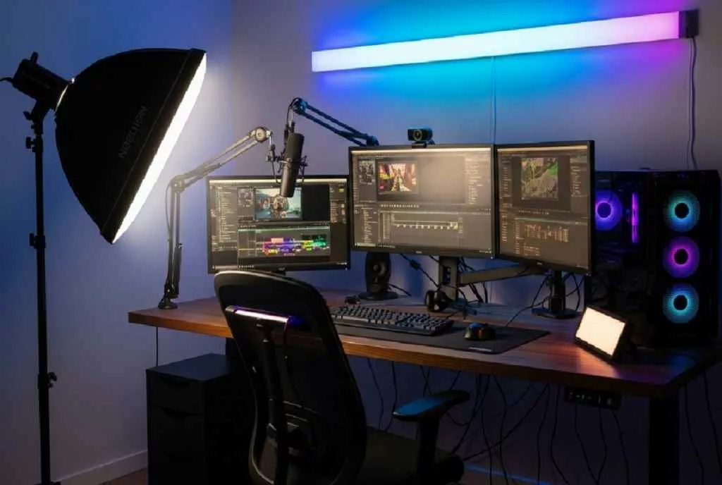 - زاویهبندی دقیق: نور اصلی را کمی بالاتر و از زاویه ۴۵ درجه بتابانید تا کمترین تداخل را با صفحه مانیتورها داشته باشد.