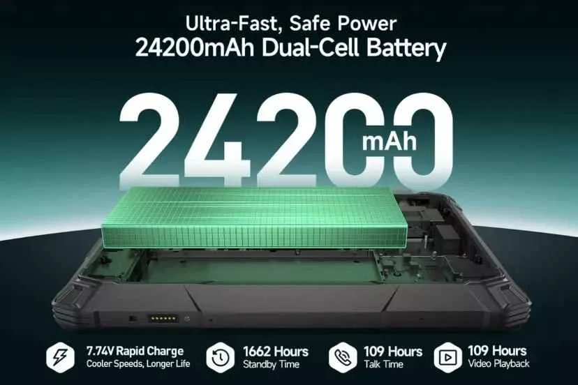 درون بدنهی قدرتمند Armor Pad 5 Ultra، باتری دو سلولی ۲۴٬۲۰۰ میلیآمپرساعتی قرار دارد؛ عددی که حتی از برخی لپتاپهای حرفهای هم بیشتر است. این ظرفیت، بزرگترین باتری میان تمام تبلتهای جانسخت جهان تا امروز محسوب میشود.